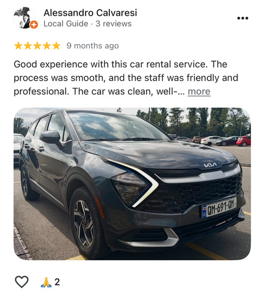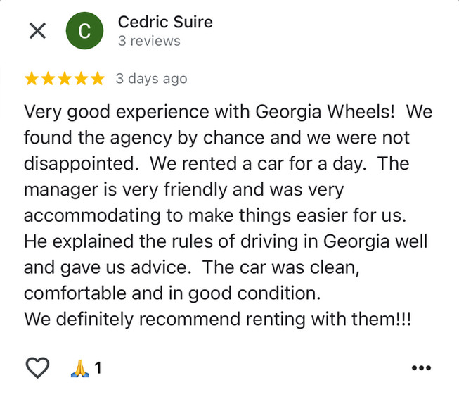 At Georgia on Wheels, we aim to offer not just top-quality vehicles and great deals, but also exceptional customer service. Your satisfaction is our priority, and we want to ensure your journeys in Georgia are seamless and enjoyable. Below, you'll find Google Maps reviews from past customers, sharing their experiences with us.